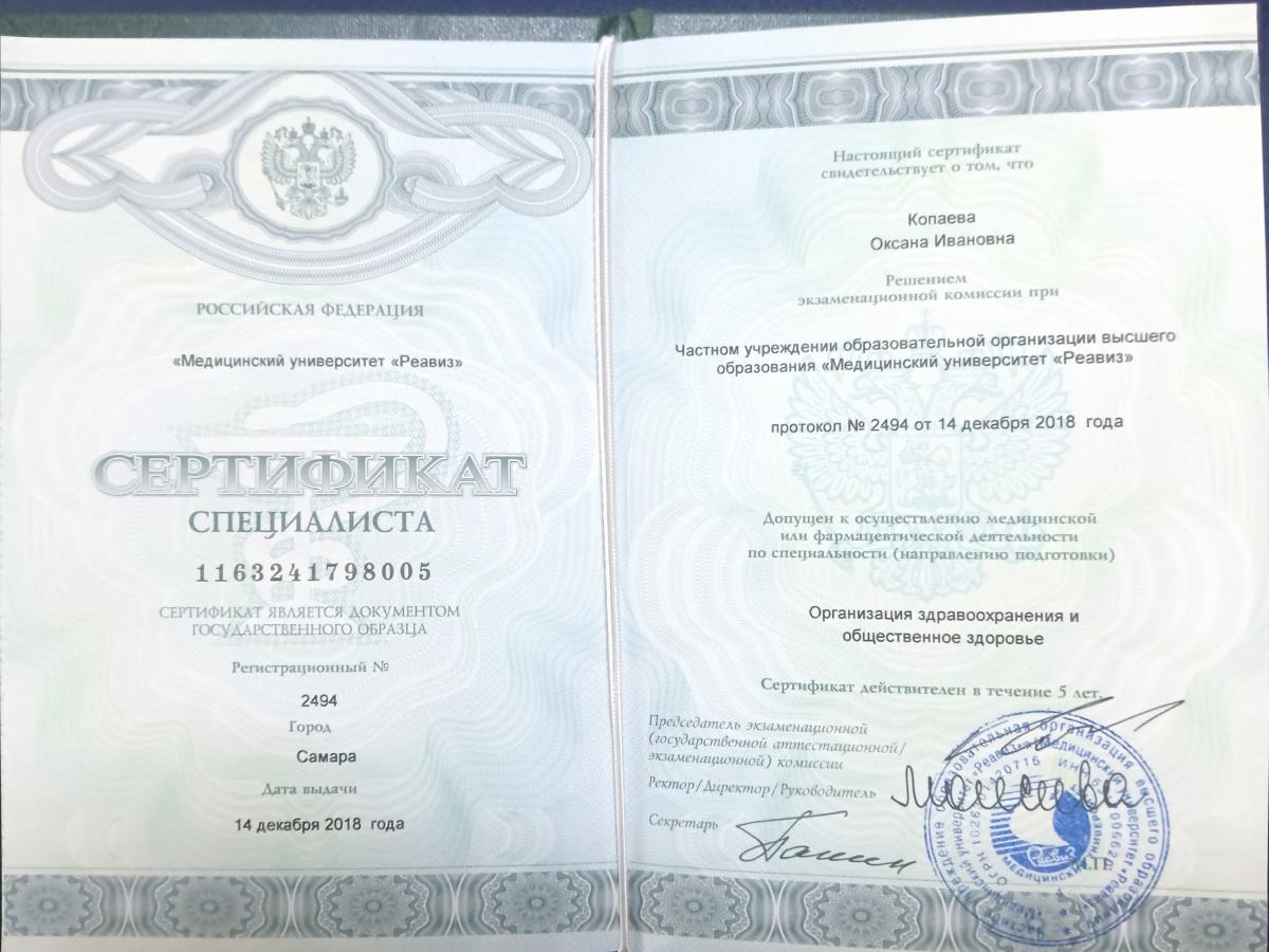 Копаева - сертификат "Организация здравоохранения и общественное здоровье"
